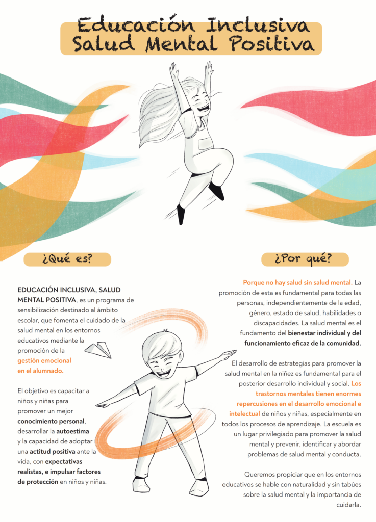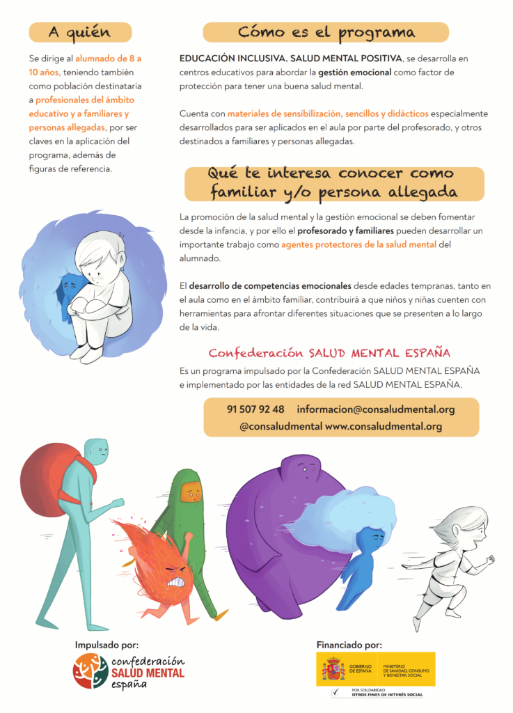 El programa, impulsado por la Confederación Salud Mental España, consiste en la realización de charlas y actividades para la sensibilización en centros educativos, dirigidas, principalmente, a profesorado y alumnado de 2º y 3er ciclo de EPO, es decir, de 8 a 12 años. El objetivo es la promoción de la salud mental en el ámbito educativo a través de la entrega de material informativo y herramientas que proporcionen información objetiva y actualizada sobre los problemas de salud mental en niños, niñas y adolescentes, así como promover entornos educativos inclusivos.