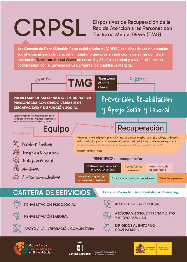 Estas infografías están pensadas como una herramienta visual y accesible para profesionales, personas usuarias y familiares. En ellas se explica de forma sencilla qué es el CRPSL, a quién va dirigido y cuáles son las principales áreas de intervención que se trabajan en el centro.